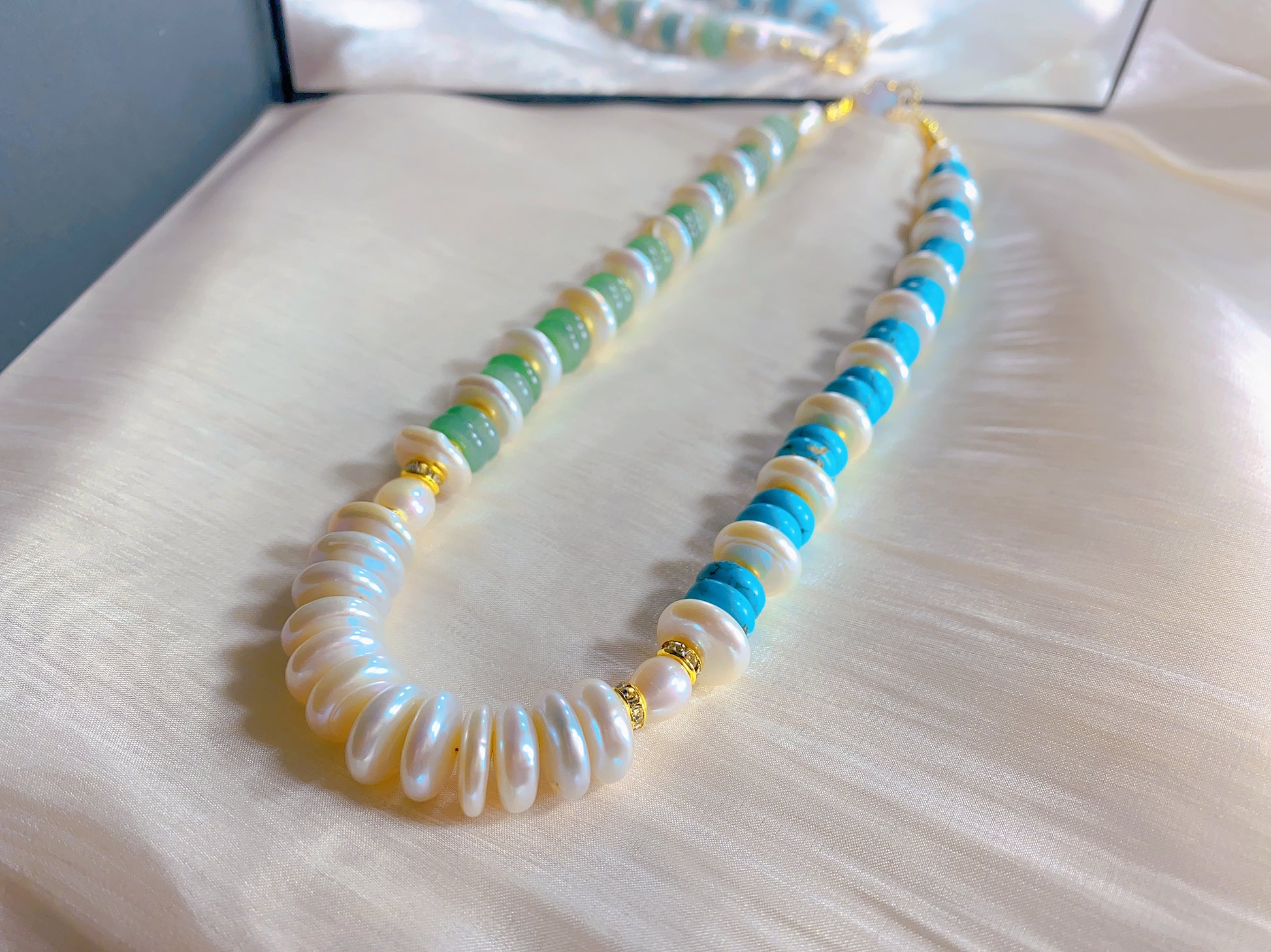Half Blue Turquoise and Half Aventurine, and natural shape button pearls 12.5mm