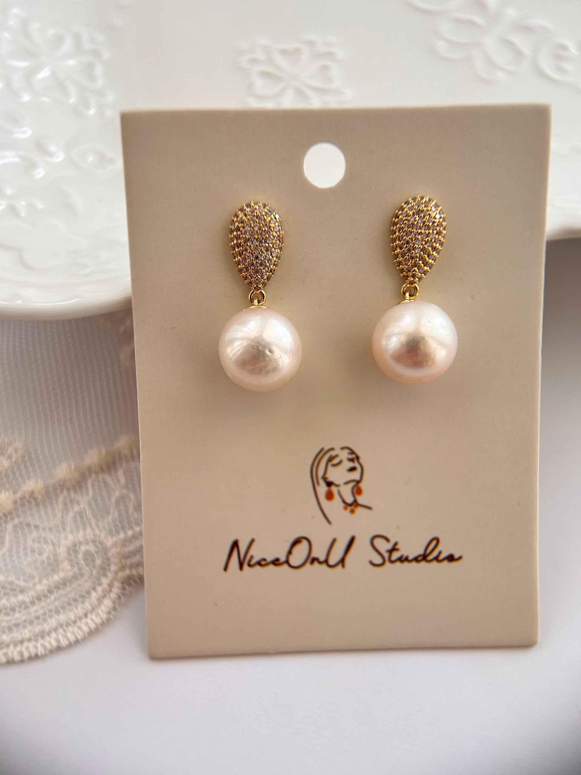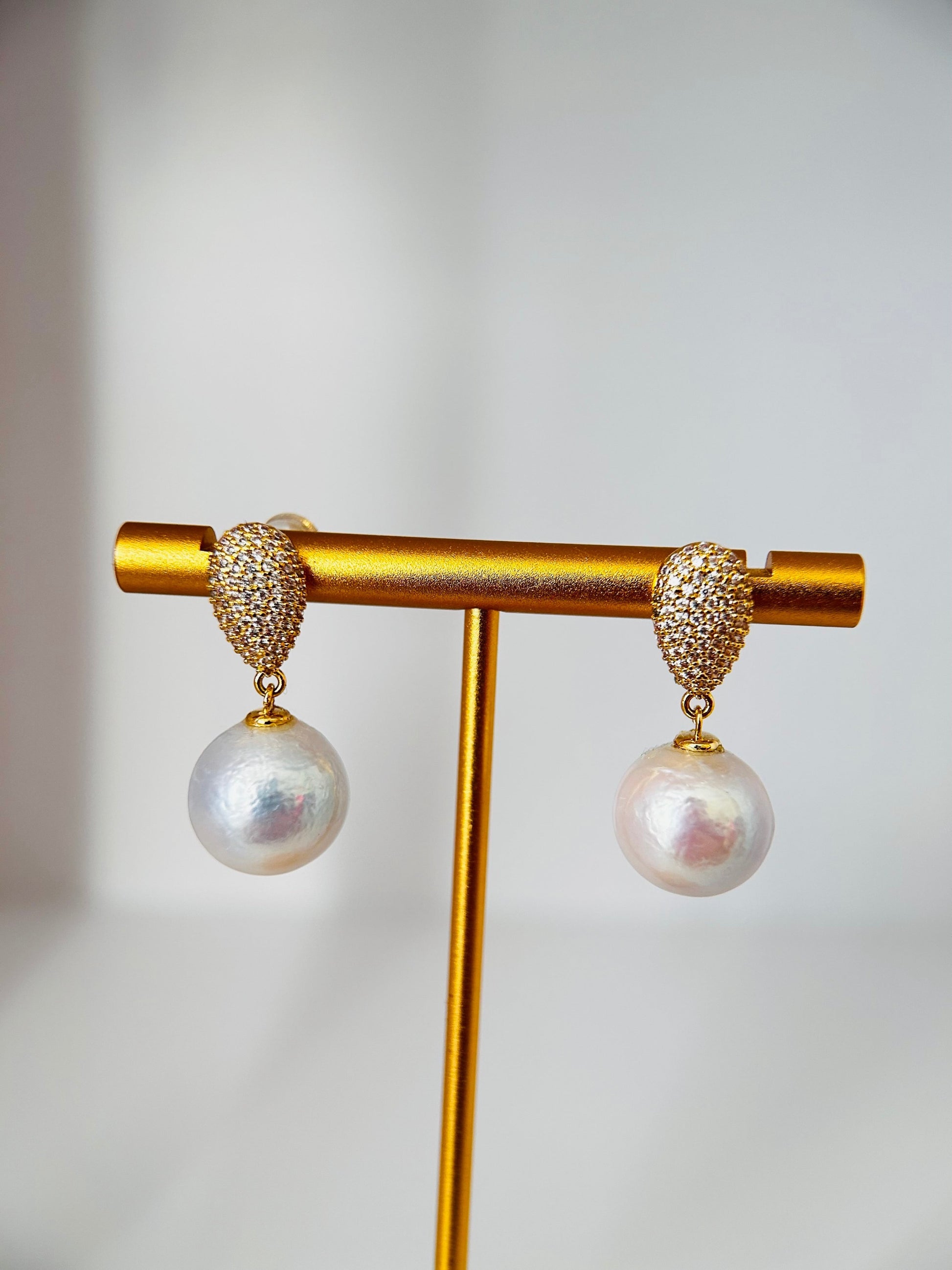 The 14K gold-plated setting beautifully showcases 12mm jumbo pearls, each with a unique shape for a touch of natural charm. The sterling silver studs add a touch of elegance, making these earrings the perfect blend of sophistication and style. Elevate any look with these timeless and radiant accessories.