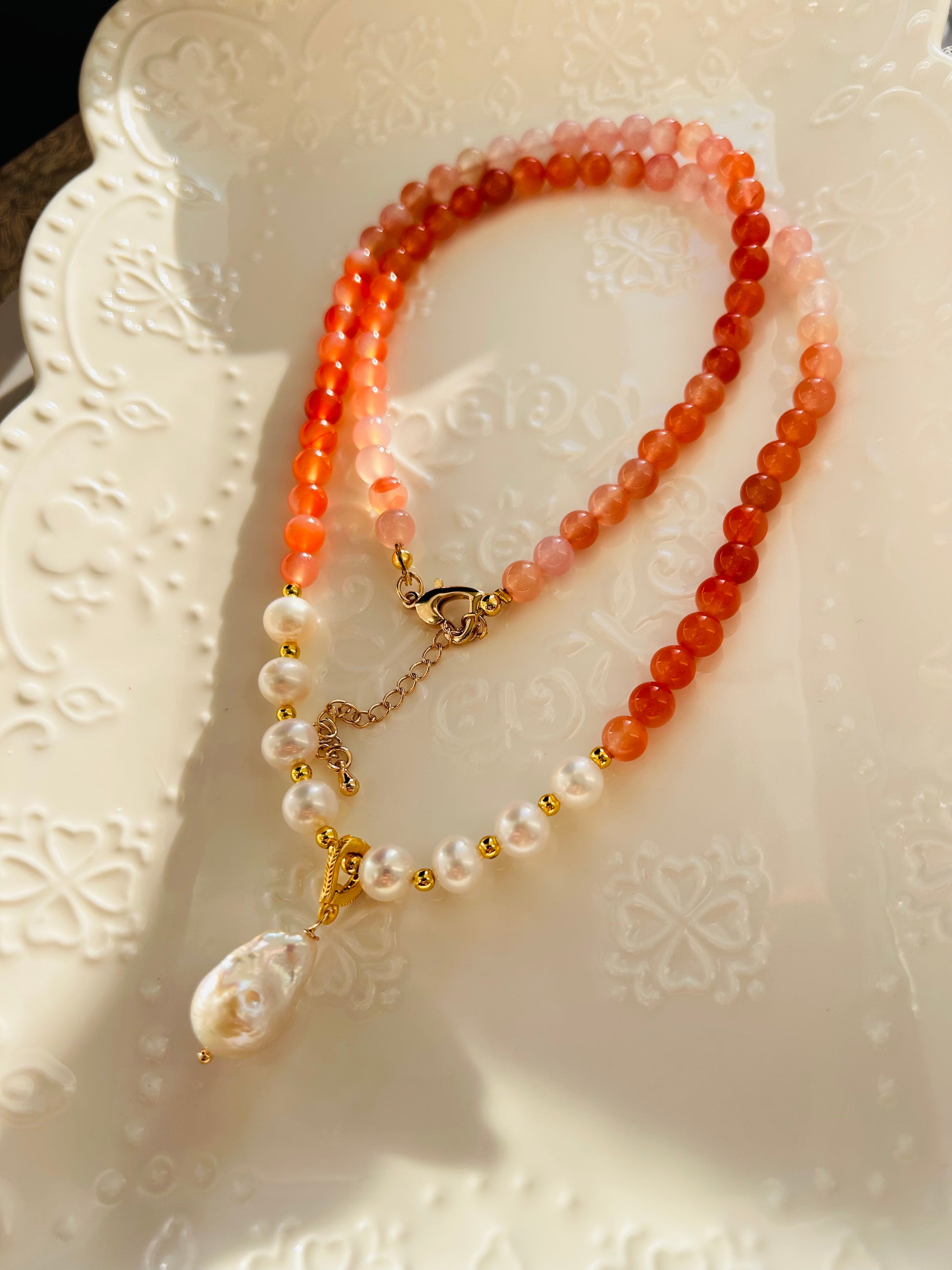 Gradient Red Agate natural Gemstones with Freshwater Pearls and an independent Baroque pearl pendant
