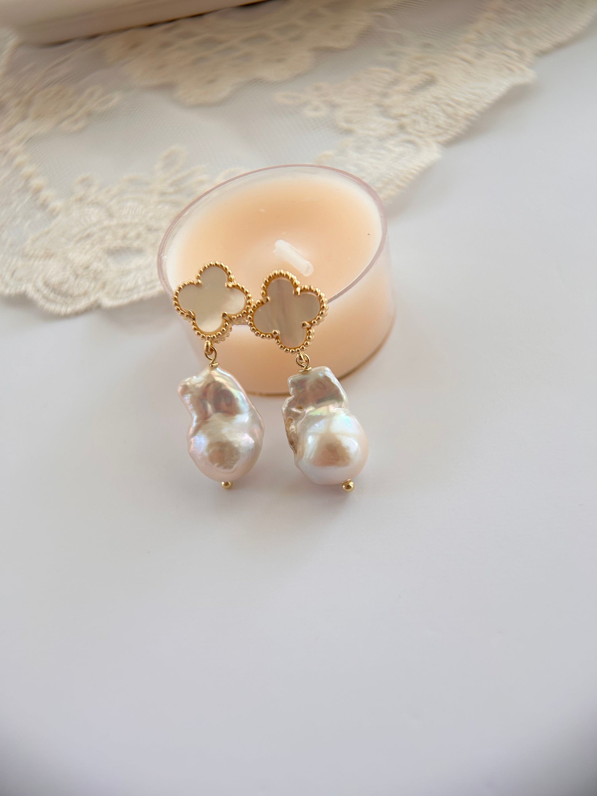White Big Baroque Freshwater Pearls Four-Leaves Studs